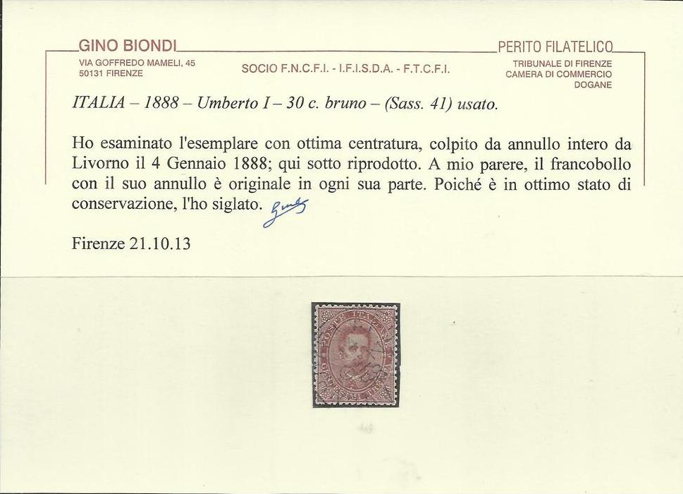 ITALIA REGNO 1879 RE UMBERTO I 30 CENT. ANNULLO LIVORNO ARDENZA OTTIMA CENTRATURA CERTIFICATO ITALY KINGDOM USED